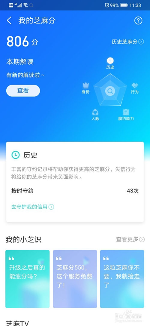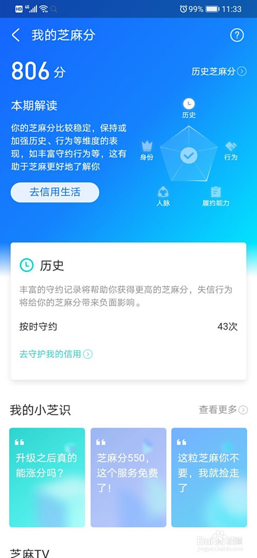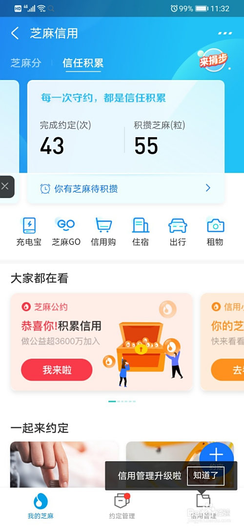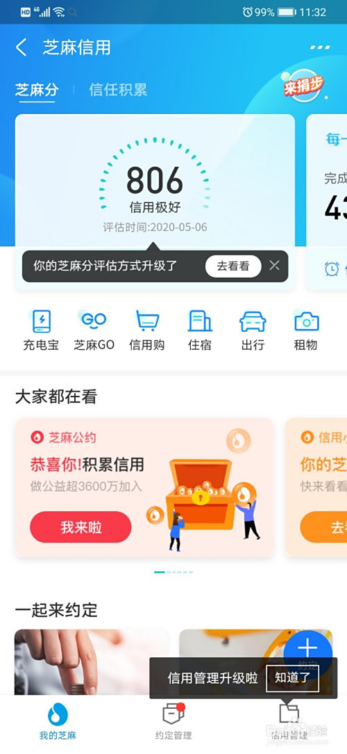 进入之后,就可以看到我们的信用分以及守约的一些记实了。