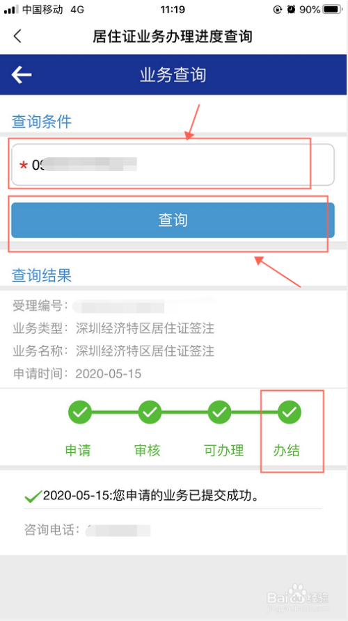在查询前提输入框输入受理编号,点击查询,即可查询到打点进度环境,显示“办结”,则暗示打点完当作,如下图所示