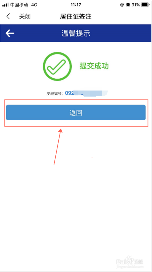10.提交当作功,截图或记下受理编号,点击“返回”。