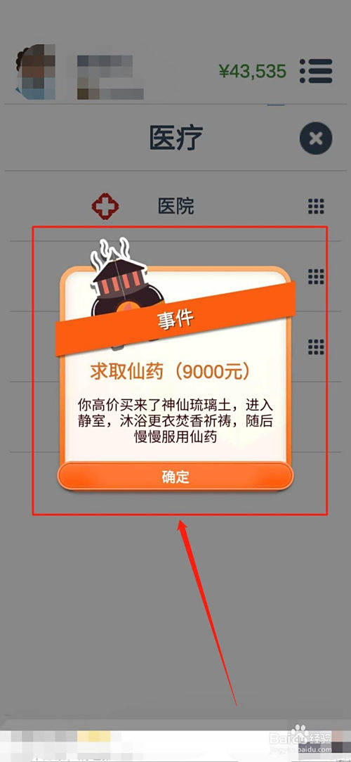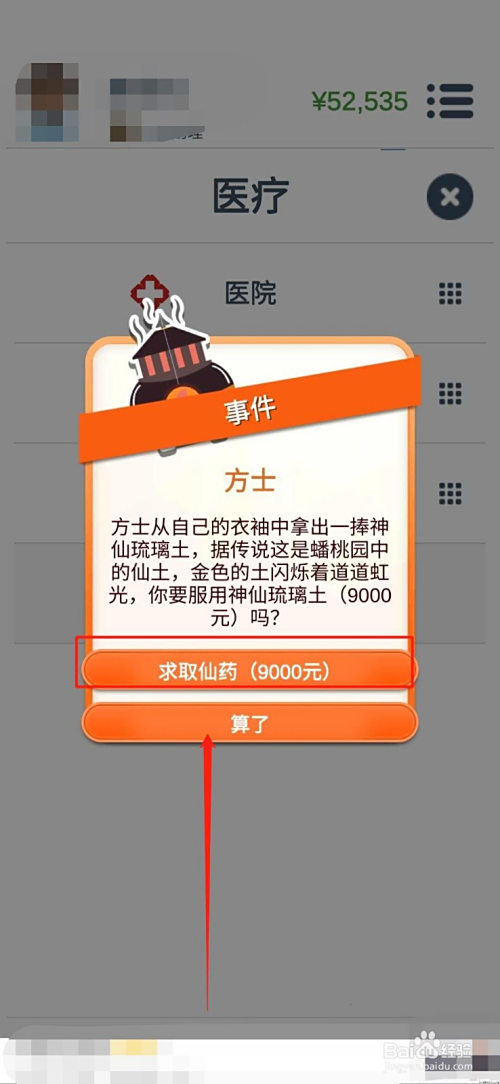 进入“术士”的界面后。花9000元直接点击第一行的“求仙取药“,如图。