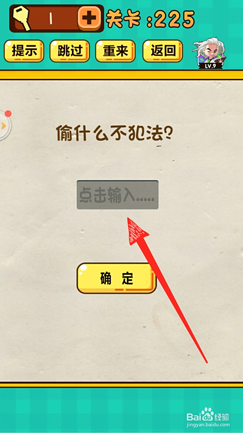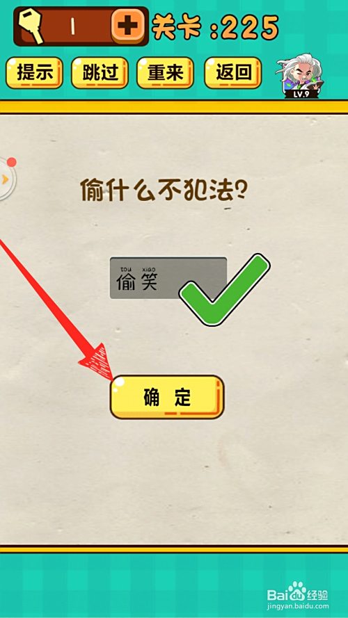 5.最后成果如下图,输入谜底“偷笑”,呈现绿色对勾,即可过关。