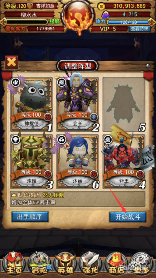 按下图所示声势设置英雄站位和出手挨次,点击起头战斗。