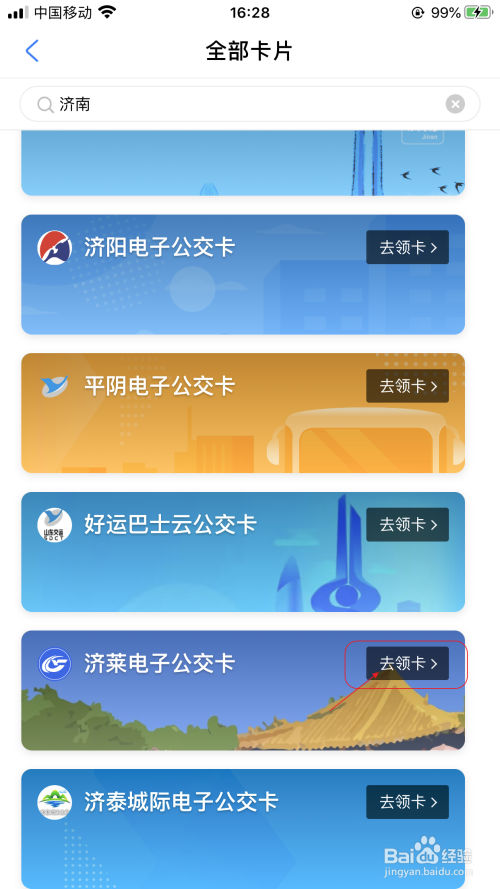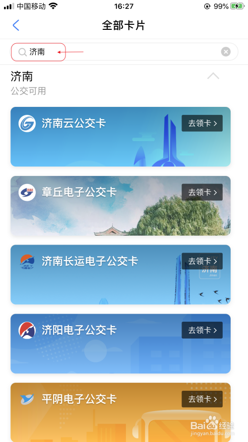 在聊天框中输入我们地点的城市,然后找到我们要用的公交卡,点击去领卡。