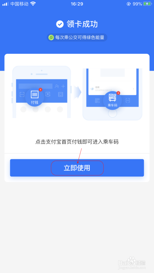 领卡当作功就可以利用了,我们点击当即利用刷搭车码就可以搭车了。