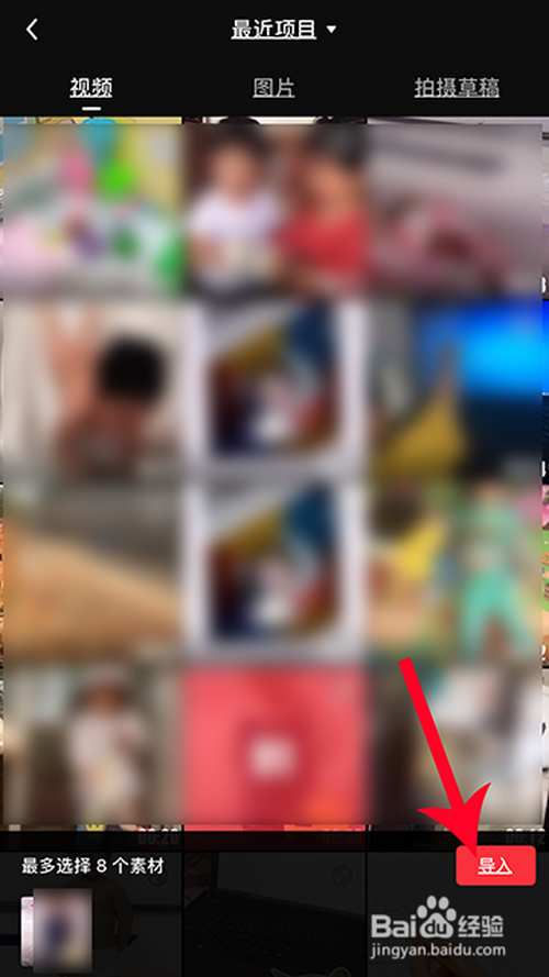 2.选择手机相册的素材,点击“导入”。