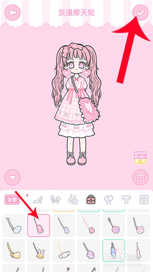 耳朵上戴一对桃心耳饰,背一个桃心书包点击对勾,挑战当作功通关。