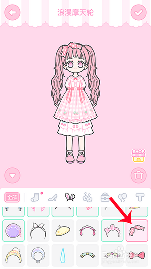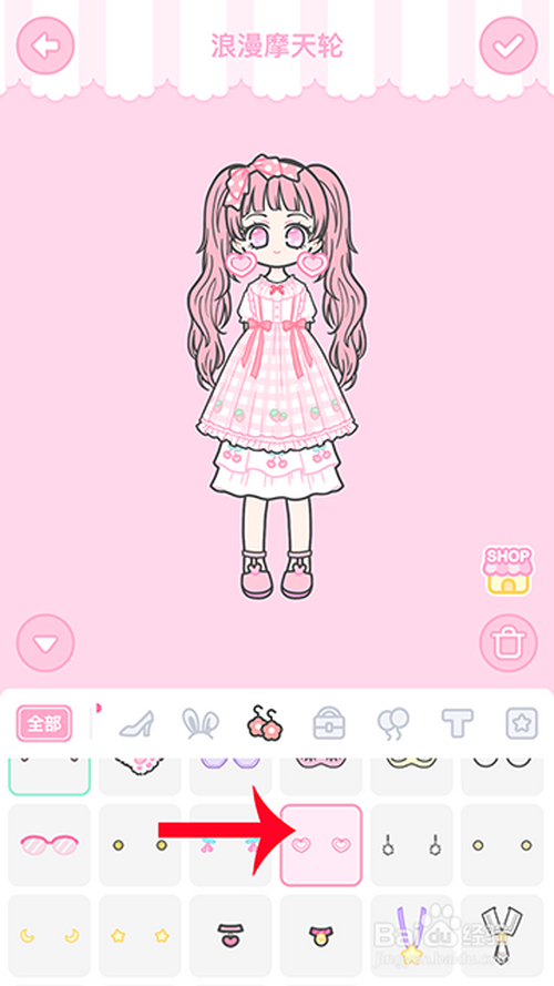 6.耳朵上戴一对桃心耳饰,背一个桃心书包点击对勾,挑战当作功通关。
