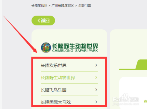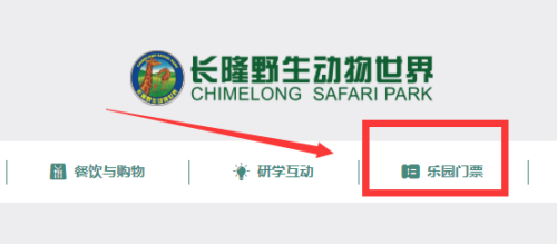 门票界面,点击左侧菜单栏“长隆野活泼物宿世界”。