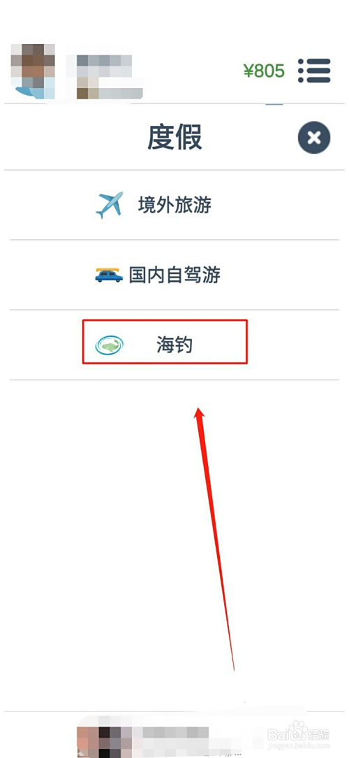 进入“度假”的界面后。直接点击第三行的“海钓“,如图。