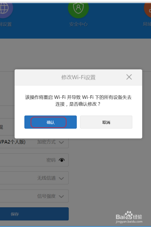 点击保留按钮后,弹出点窜Wi-Fi设置提醒框,将会重启Wi-Fi以及其他设备将掉去毗连,是否确定点窜,点击“确认”按钮。