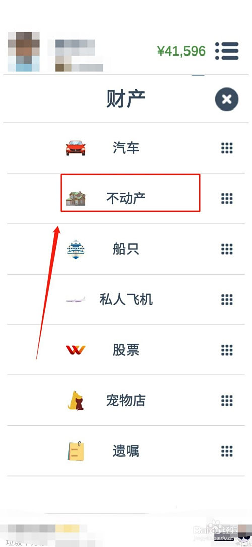 进入“财富”界面后,直接点击“财富”里第二行的“不动产”,如图。