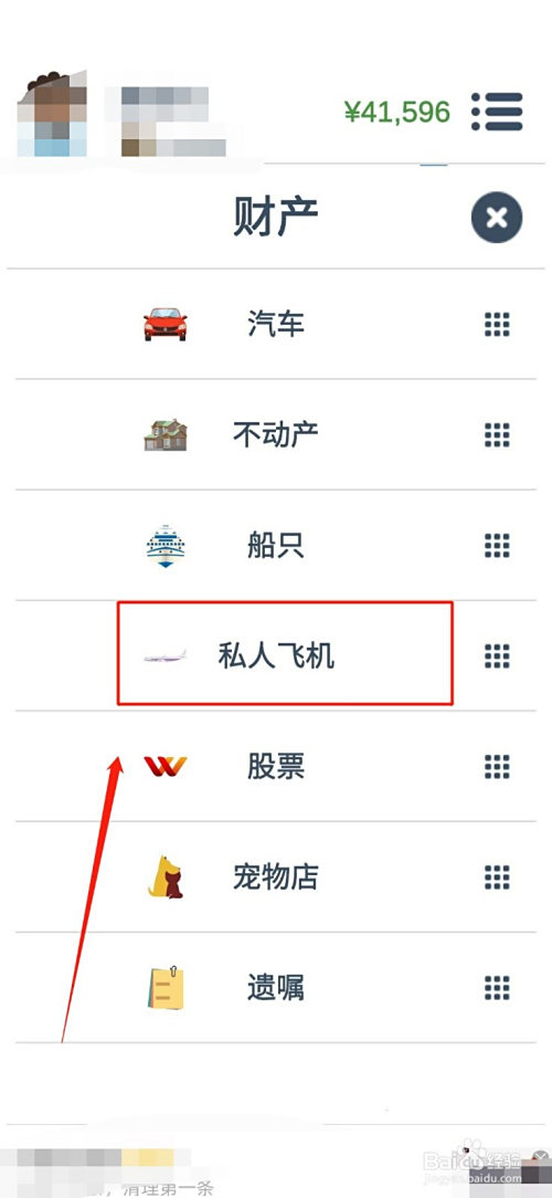 进入“财富”界面后,直接点击“财富”里第四行的“私家飞机”,如图。