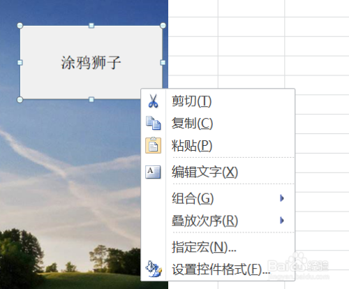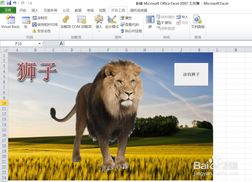 7.将按钮控件定名为“涂鸦狮子”,然后点击右键,选择“指定宏”选项。