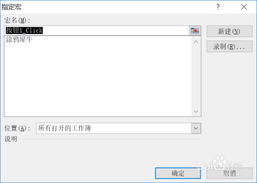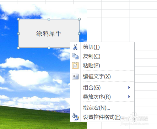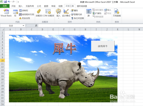 7.将按钮控件定名为“涂鸦犀牛”,然后点击右键,选择“指定宏”选项。