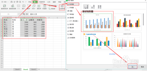 2、点击插入柱形图图表;