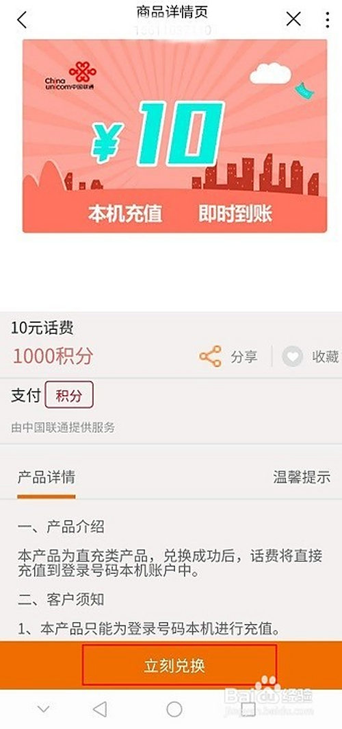 以积分兑换话费为例,选择10元话费>立即兑换即可。