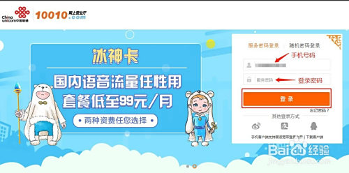 打开中国联通网上营业厅(www.10010.com),点击左上方登录>输入手机号码、办事暗码>登录;