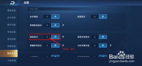 第三步:在隐私设置界面找到【贵族显示】点击【关】即可,完当作贵族标识埋没。