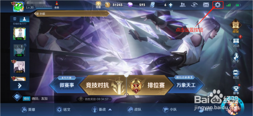 第一步:登录游戏达到游戏本家儿页面,点击右上角的【设置】齿轮按钮,进入设置界面。
