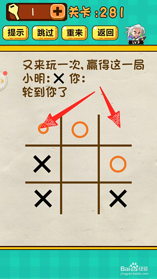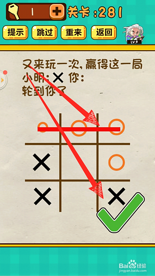 最后成果如下图,点击空棋盘,三个棋子连线,呈现绿色对勾,即可过关。