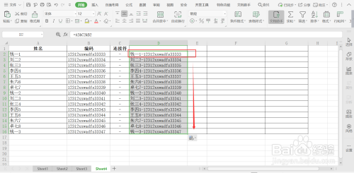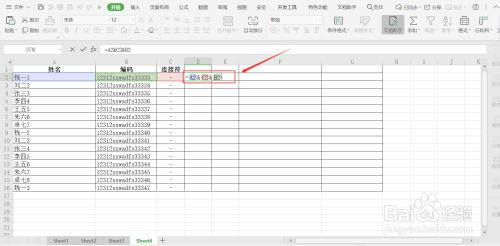 选中表格,输入公式,用&号对多列数据进行拼接,“=A2&C2&B2”,意思为将A2、C2、B2三列进归并;