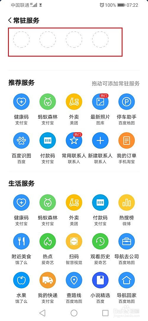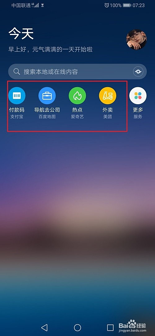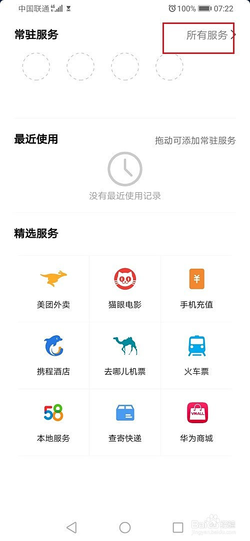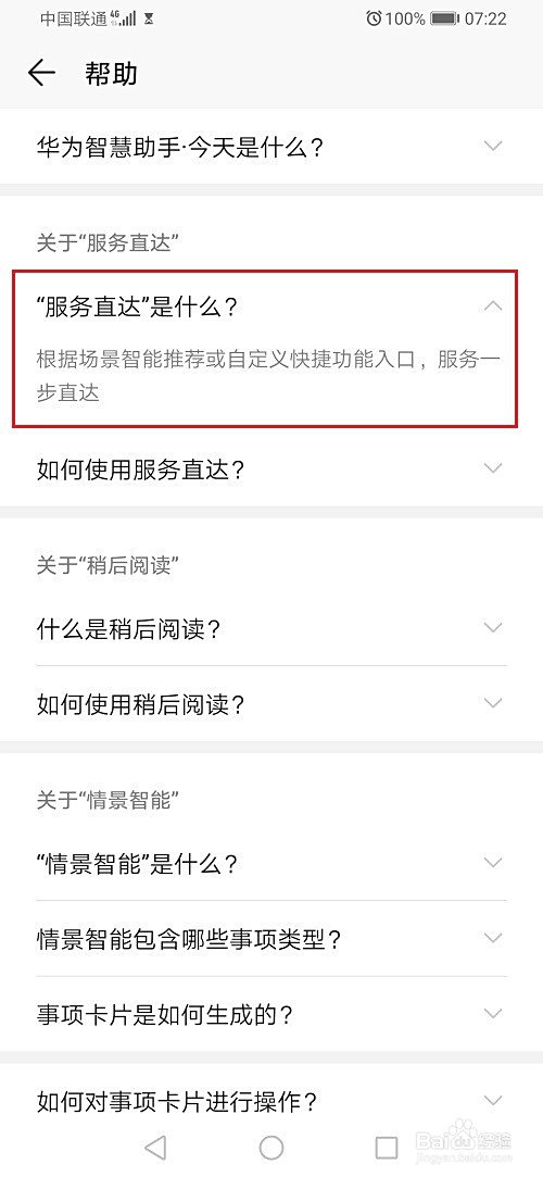 第一步华为手机的办事直达是按照场景智能保举或者自界说快捷功能进口,如下图所示: