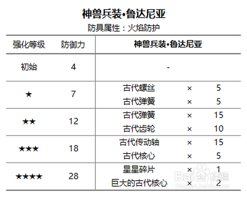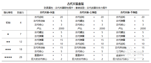 初始:古代齿轮×20、古代螺丝×5、古代焦点×3、卢比×2000
