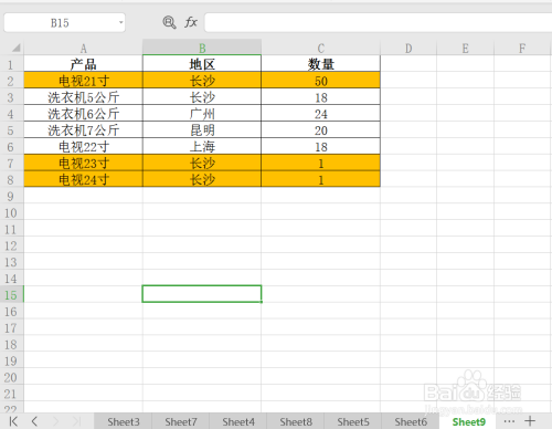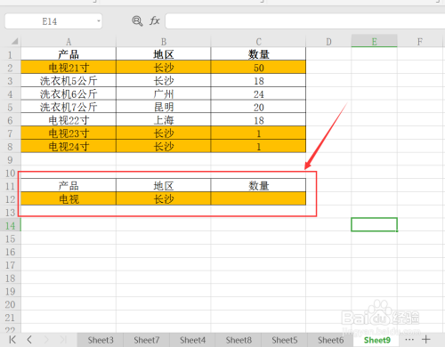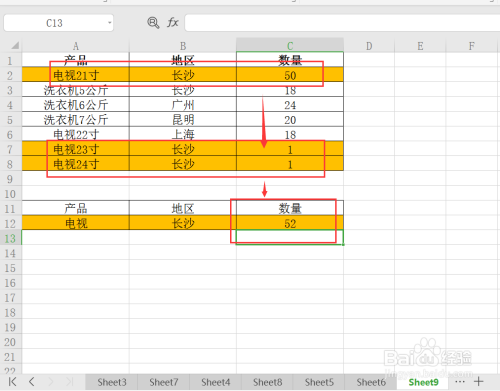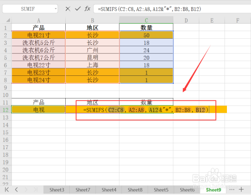 在数目列下单位格中输入计较公式,=SUMIFS(C2:C8,A2:A8,A12&"*",B2:B8,B12),解读为统计产物中包含关头字电视的总数目;