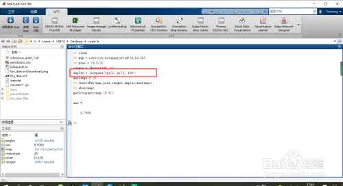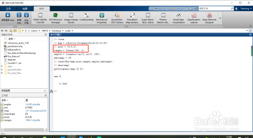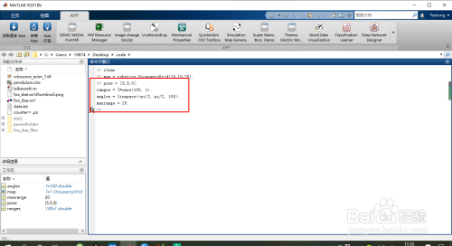 %在占用网格中插入激光扫描。指定机械人的姿态规模和角度以及