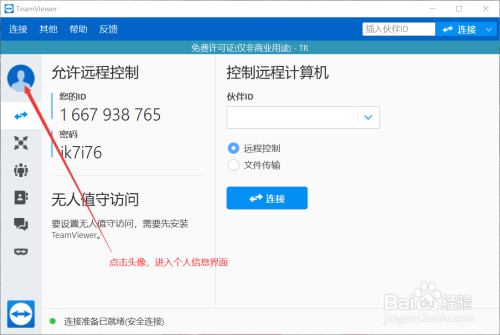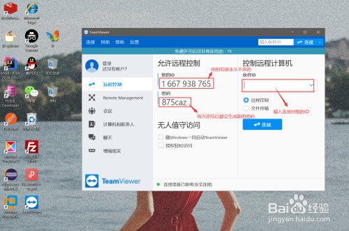 第二步:本家儿页介绍;【您的ID】暗示您的永远ID;【暗码】暗示此外机械毗连您所需要的暗码;【伙伴ID】暗示毗连对象的ID;因为每次打开TeamViewer软件暗码会主动更新当作新的随秘密码,所以小编的暗码就不做马赛克处置。