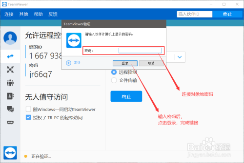 第七步:输入毗连对象ID进行毗连,提醒输入伙伴TeamViewer暗码,输入暗码后,点击登录完当作链接。