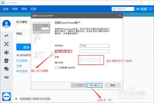 第四步:填写注册小我信息,【您的姓名】这一项软件主动检测电脑名称,不需要填写,本家儿要填写下面三项【电子邮箱】、【暗码】和【确认暗码】。点击下一步,完当作注册。