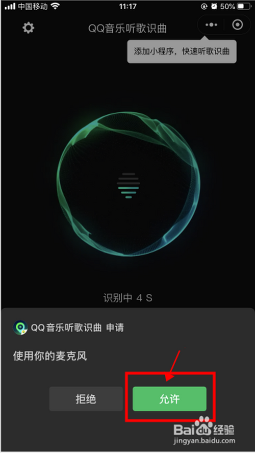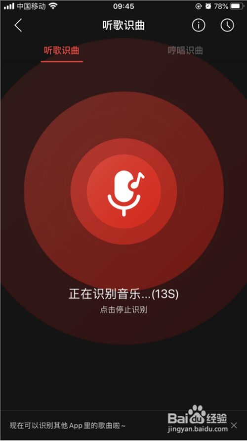 点击首页中心的听歌识曲图标,起头识别歌曲;若是弹出麦克风利用咨询框,要点点【许可按钮】。