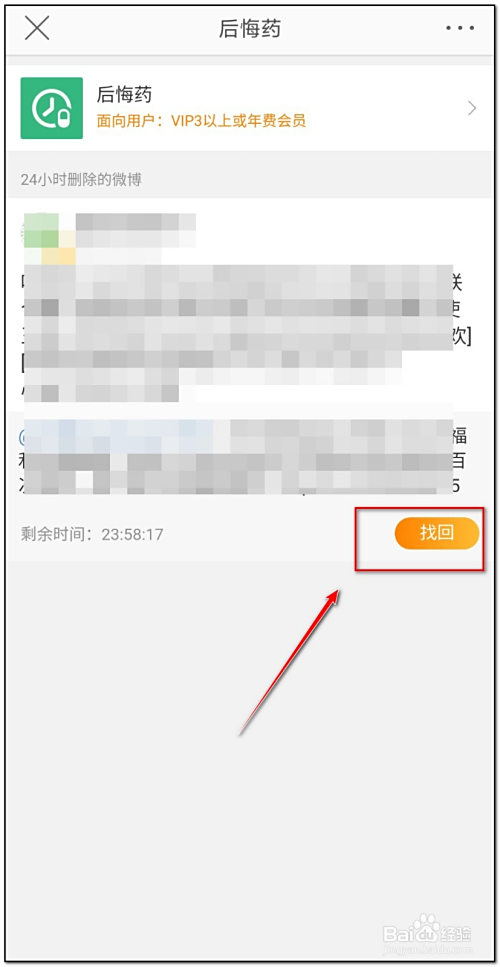 5.在此界面可以找回24小时内删除的微博并点击“找回”即可,找回合用前提如下图