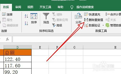 接着再打开的数据东西栏上,点击删除反复值的图标。