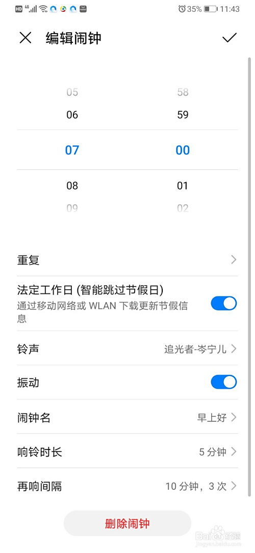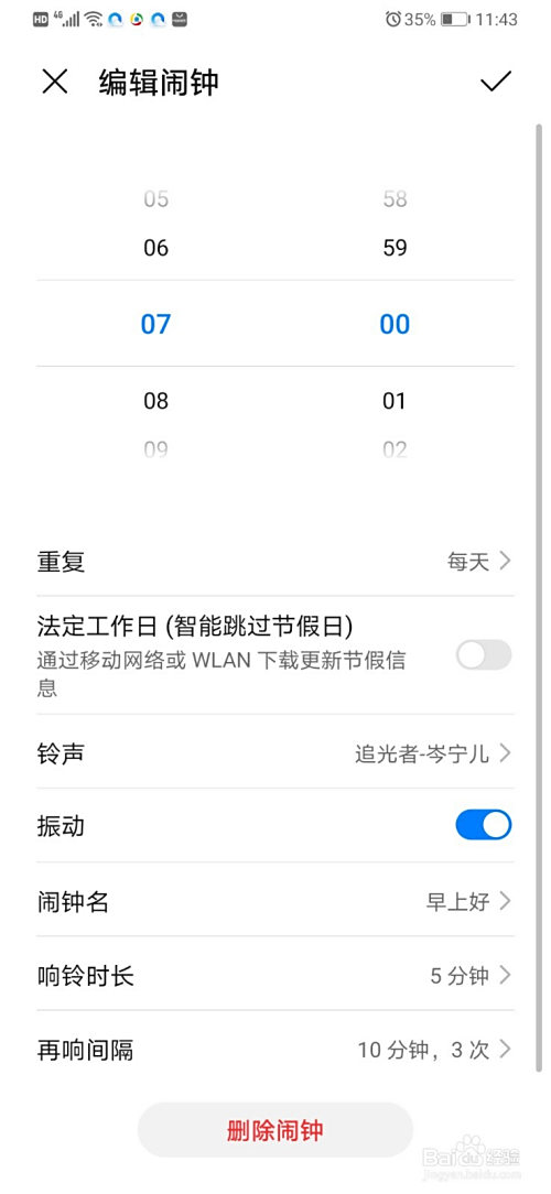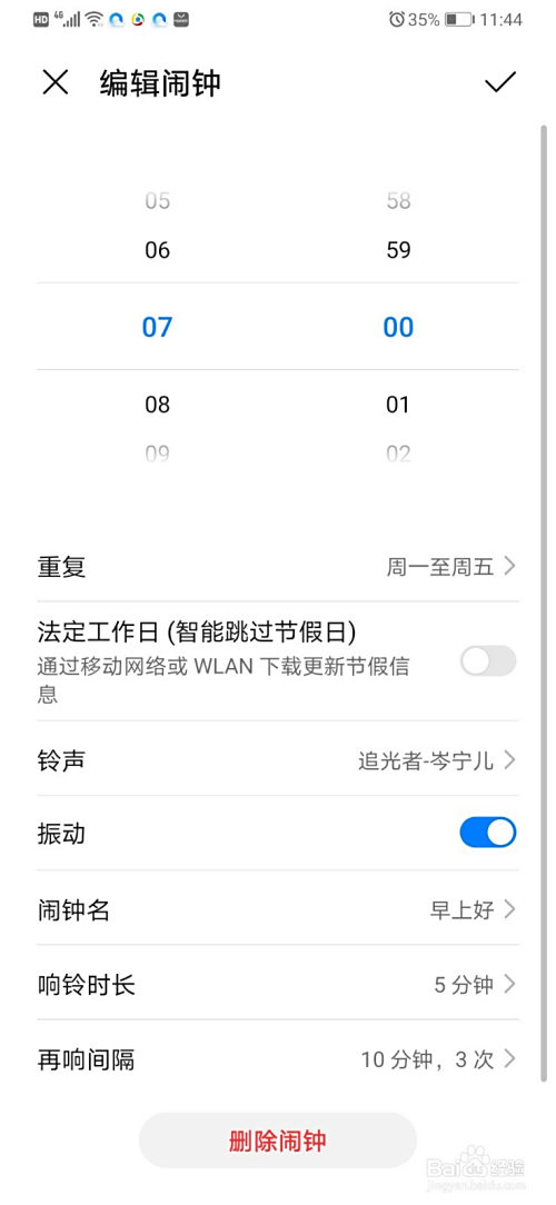 勾选之后,默认就会在法定节沐日的时辰不会响起闹铃。