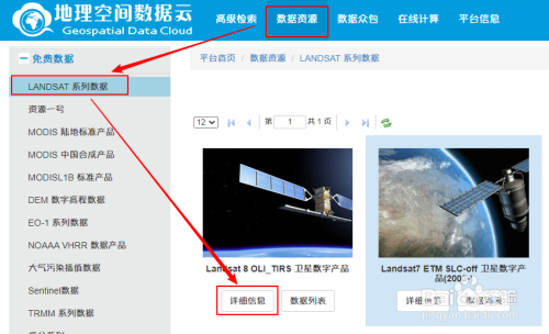 1. 点击【数据资本】->【LANDSAT系列数据】->landsat8卫星的【具体信息】