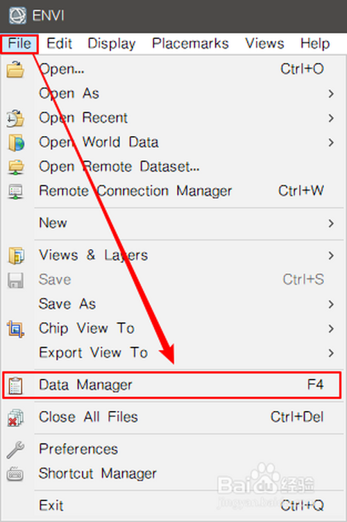 * 打开图像后,点击ENVI本家儿菜单的【File】->【Data Manager】,或者直接单击快捷键【F4】,调出Data Manager对话框