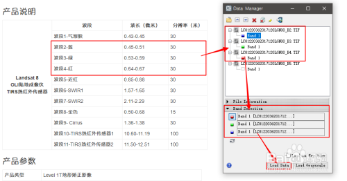 * 依次勾选B4、B3、B2数据下方Band 1前的复选框,使【Band Selection】下稀有据,然后点击【Load Data】