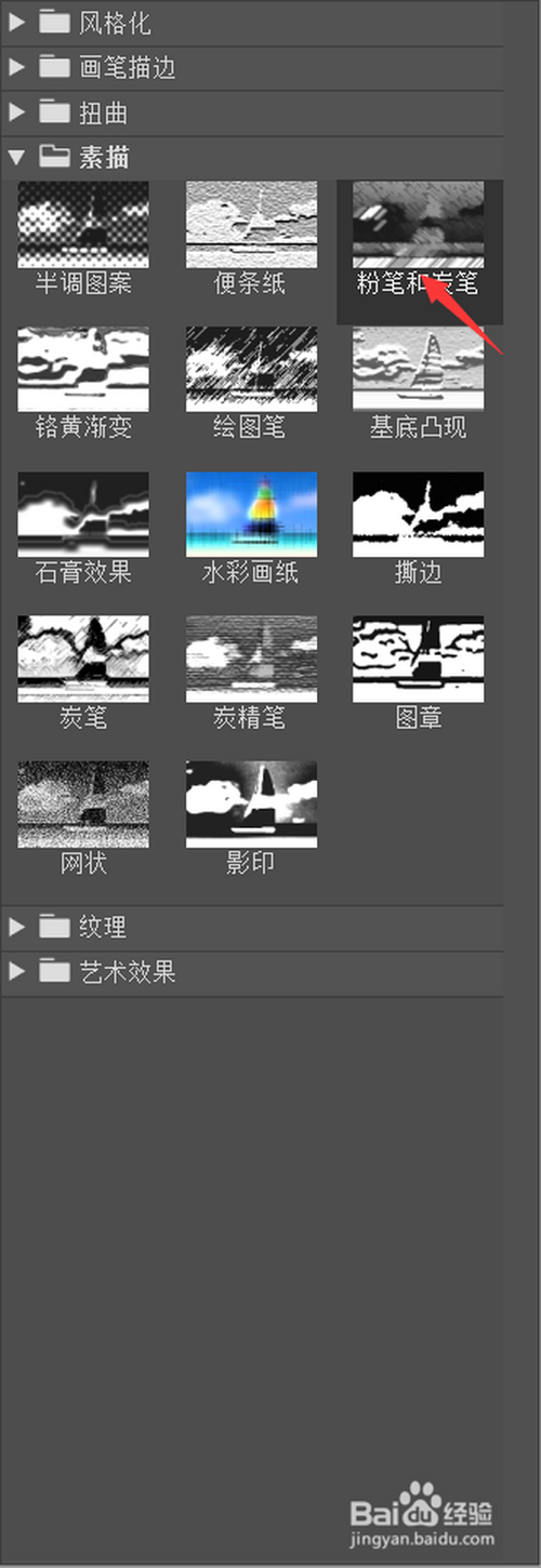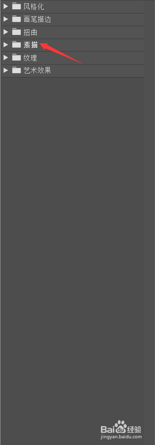 在滤镜库中选中,素描。