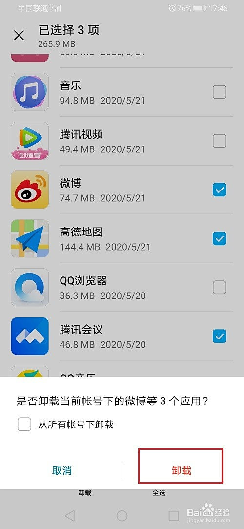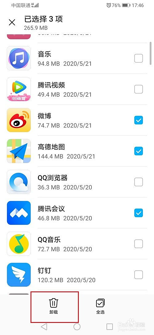 第四步点击之后,勾选要卸载的软件,点击卸载,如下图所示: