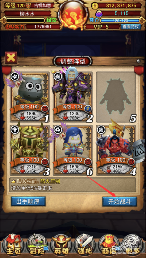 按下图所示声势设置英雄站位和出手挨次,点击起头战斗。