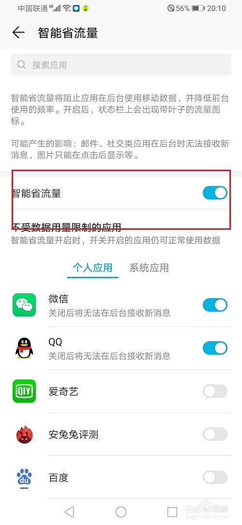 第五步进去之后,开启智能省流量,就当作功开启省流量模式了,如下图所示: