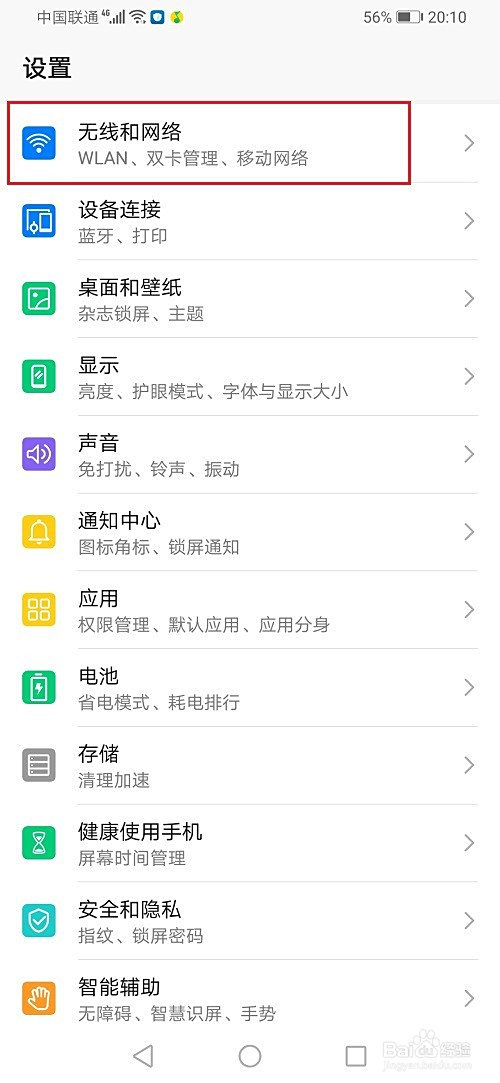 第二步进去手机设置之后,点击无线和收集,如下图所示: