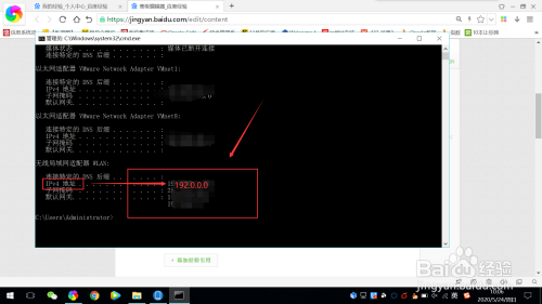 回车后,输出成果如下,因为小编连的是wifi,所有在无线局域网处,可找到我的当地IP地址。