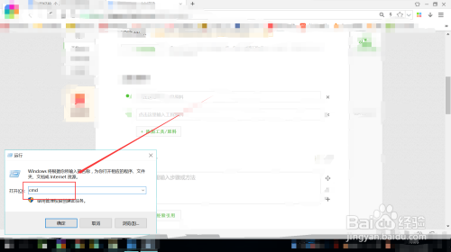 3、在运行窗口中,输入cmd,点击确定,会弹出黑色的号令窗口;