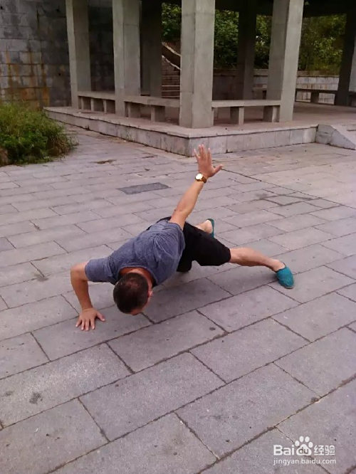 然后就可以测验考试做一个,一般的来说,单手俯卧撑做到双脚分隔,跟本身的手形当作一个三角均衡就可以做到了。