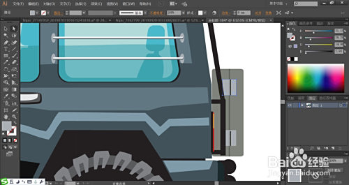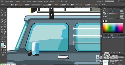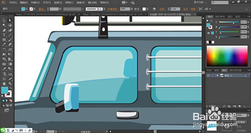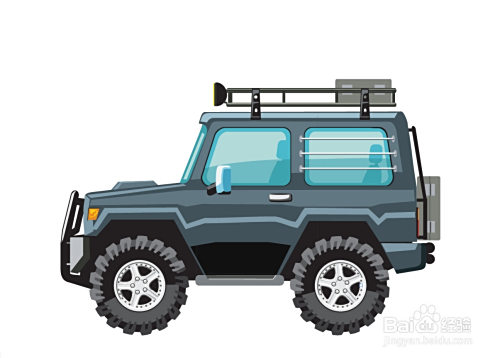 越野车的玻璃利用海蓝色与天蓝色搭配填充暗光与亮光,边缘利用黑色进行描边,不雅后镜利用白色、天蓝色与海蓝色三种色彩填充左侧到右侧的路径。