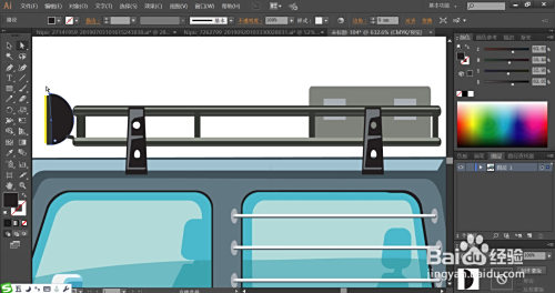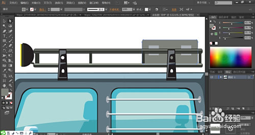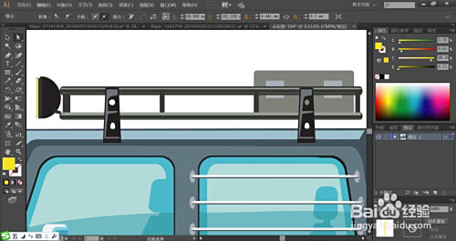 车顶的货架利用蓝灰色与灰黑色、白色搭配填充分歧的布局件,高光利用蓝灰色填充,车顶的车灯利用黄色与黑色搭配填充左侧与右侧的布局件。