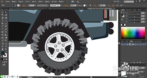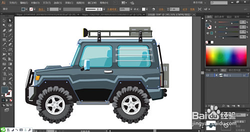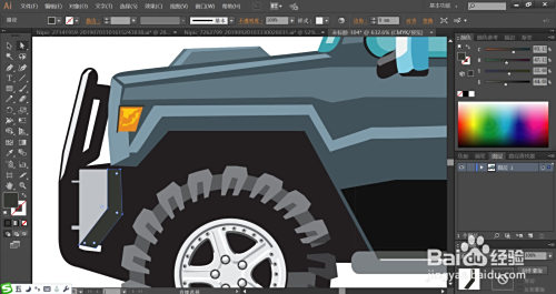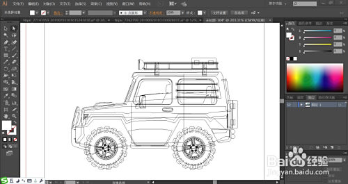 利用钢笔画出越野车的车体轮廓,再画出车门细节与车窗的玻璃细节,接着,我们画出车顶的布局件,车轮表里的细节元素的路径。
